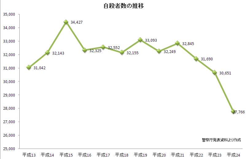 警察庁の統計によりますと平成24年の自殺者数は27,766人で15年ぶりに3万人を下回りました。