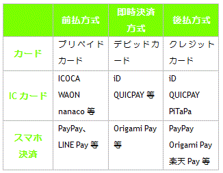 種類として、支払方法による分類と、形式による分類があり、まとめると下記の表のようになります。