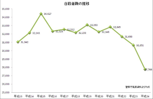 警察庁の統計によりますと平成24年の自殺者数は27,766人で15年ぶりに3万人を下回りました。 しかしながら、依然高い水準が続いています。メンタルヘルスの不調の延長線上に自殺があると考えられ、 国が対策に乗り出すなど社会問題の一つとなっています。